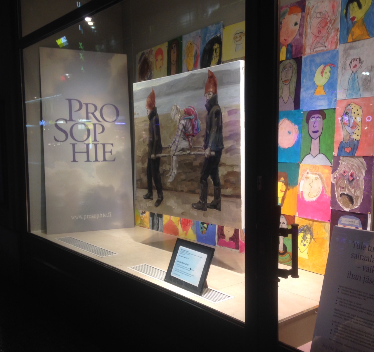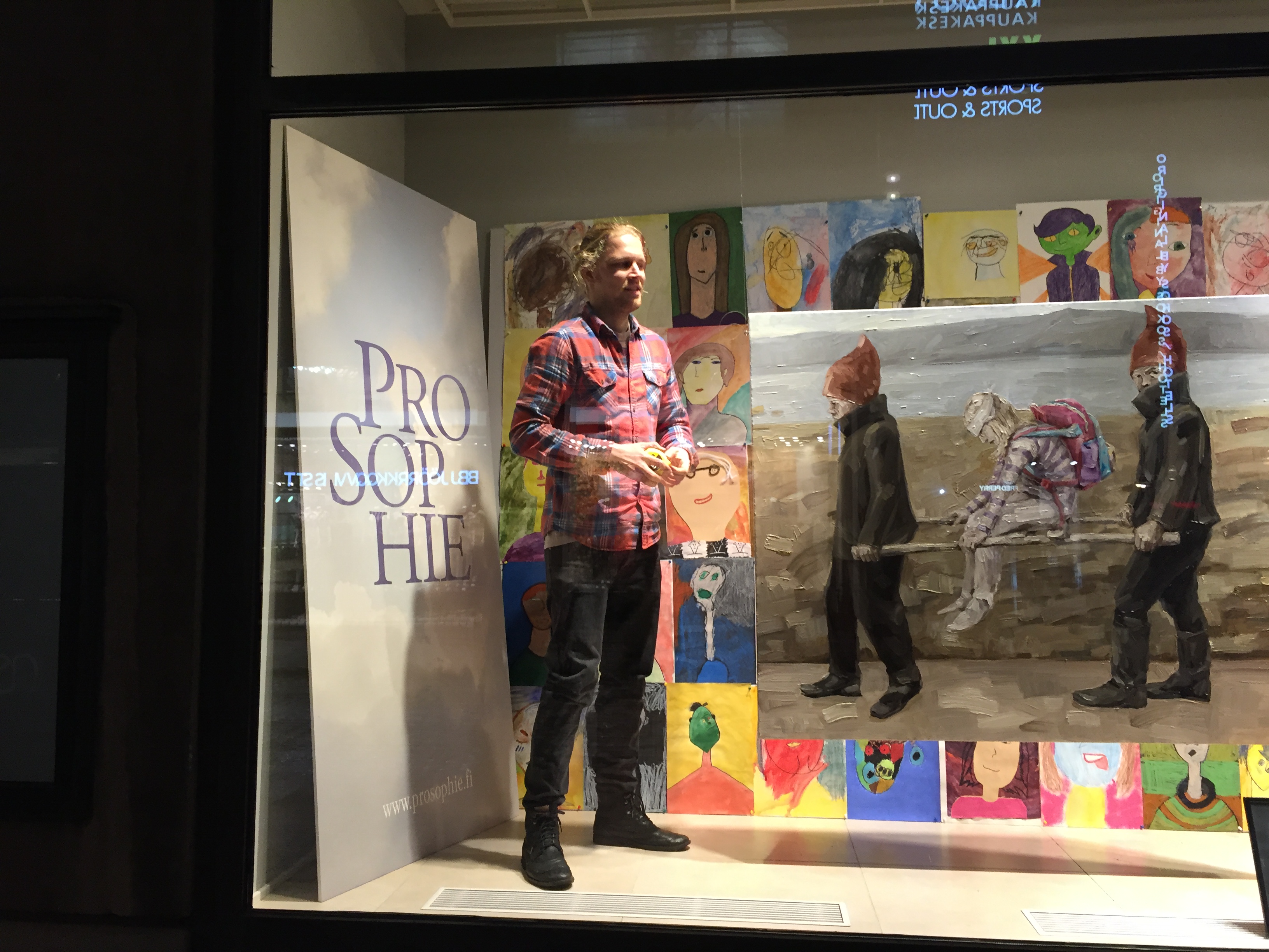 Kuvat on nyt kiinnitetty ja muovilla suojattu. Hissimatka näyteikkunaan alkaa.