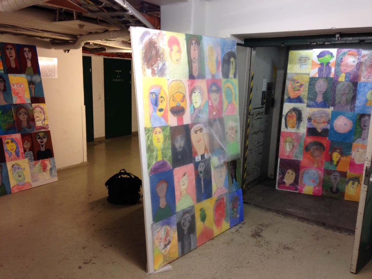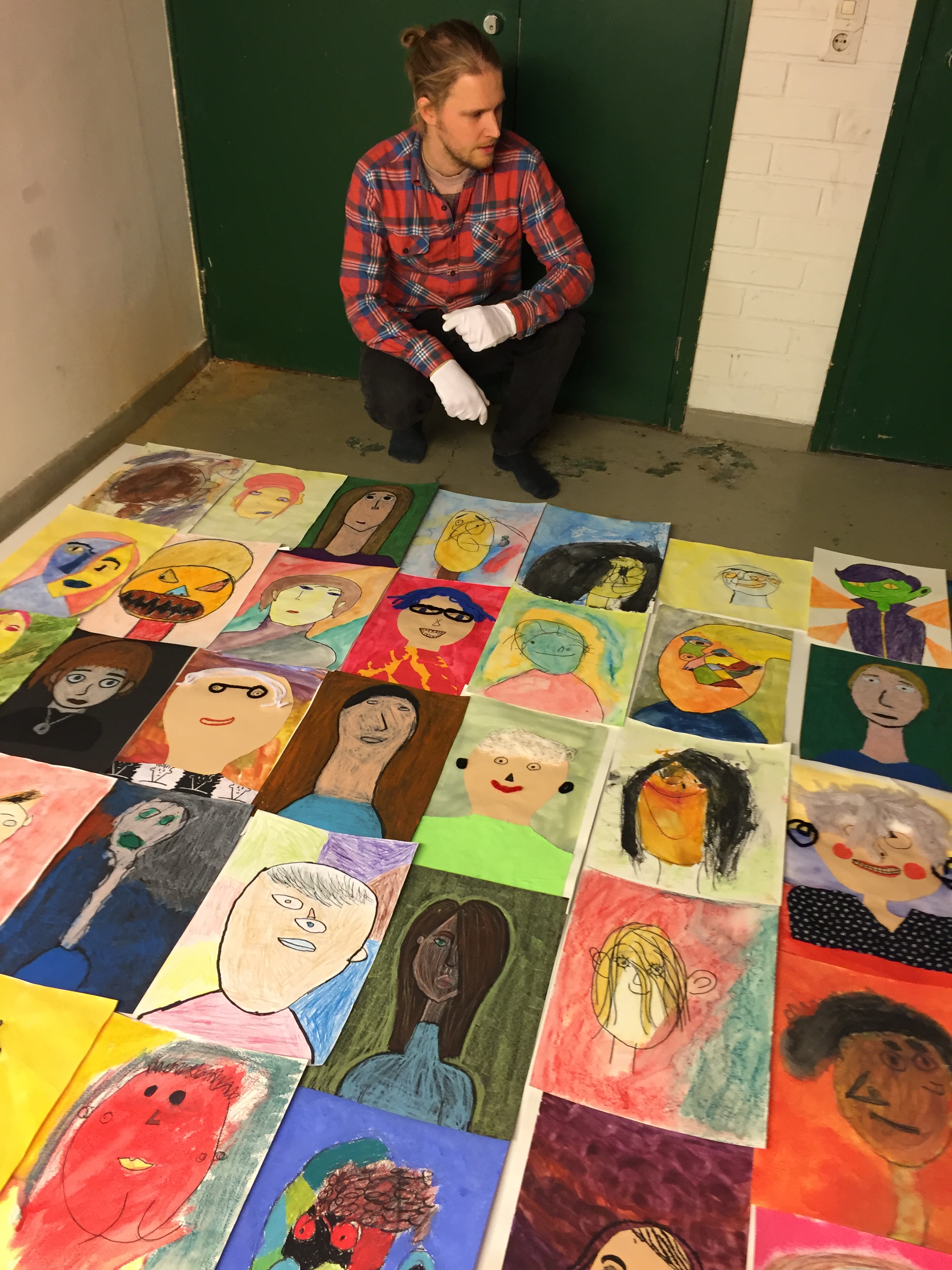 Kuvataiteilija Topi Ruotsalainen sommittelee oppilaiden omakuvia levyille MaxMaran kellaritiloissa. Kuvat ovat todella mahtavia –lämmin kiitos Sophien oppilaat!!!