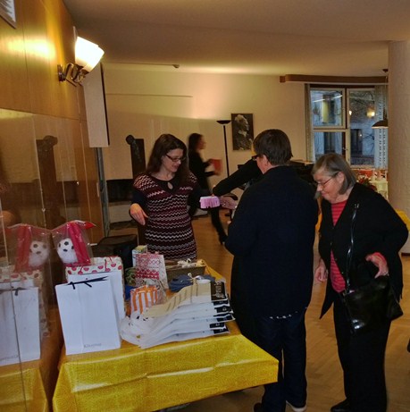 Seija Rantasalo ja Marsa Luukkonen (selin) ostavat innokkaina arpoja hallituksemme jäseneltä Tiina Kalliokoskelta.