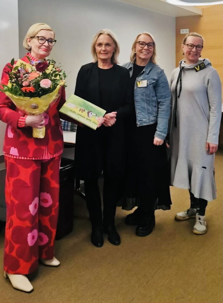 25 Sophie Mannerheimin koulun oppilasta pääsi vierailemaan Eduskunnassa 1.10. 2025. Kuvassa vasemmalta eduskunnan varapuhemies Paula Risikko, Pro Sophien kunniapuheenjohtaja Pirjo-Riitta Antvuori, rehtori Anna-Kaisa Lindquist sekä erityisluokanopettaja Kati Hakala. Oppilaita ei näy kuvissa sillä emme halua rikkoa heidän tietosuojaansa.